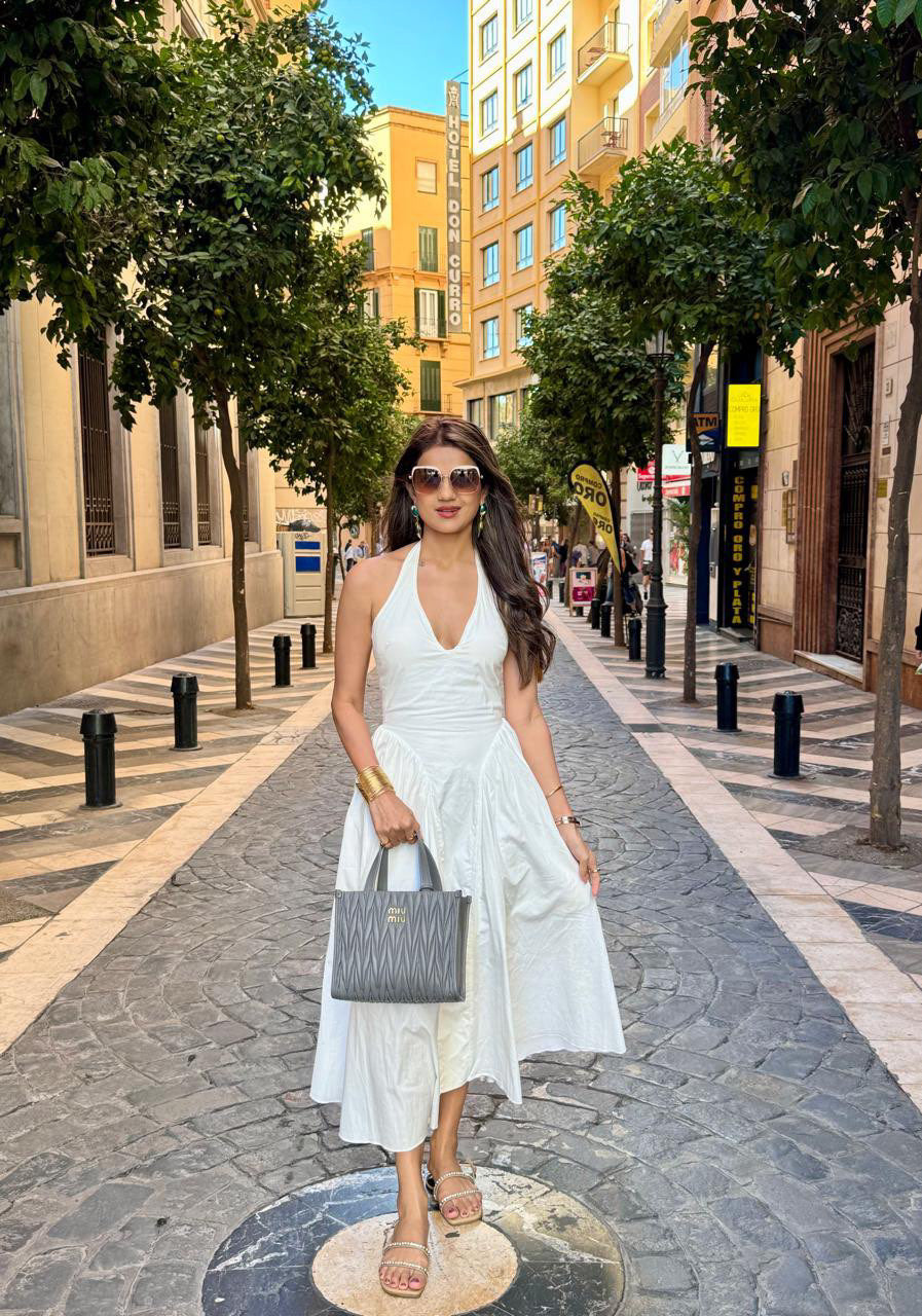 Turn heads , buy our elegant halter neck long dress, designed to make a statement. This sophisticated dress features a sleek halter neckline that accentuates the shoulders, while the floor-length silhouette creates an elongated, graceful look